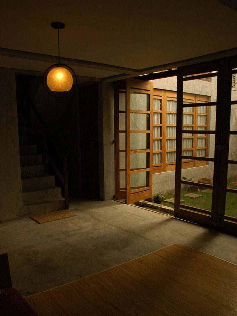 Situated on a 144 m² plot, the house was designed to meet the client’s comprehensive brief for five bedrooms: a master suite, a guest room, a children’s room, and two rental units. This was achieved by optimizing the floor plan, ensuring every space maintains a visual connection to the outdoors, which enhances the perception of spaciousness and natural light.Three pocket gardens were integrated into the front, rear, and core of the house to maximize natural daylight and optimize cross-ventilation. Budgetary constraints were addressed through key design decisions, including a slightly lowered ceiling height of 2.4 m and the specification of frameless wooden windows and doors. Local bricks were used for the facade, reflecting the character of the surrounding kampung environment.